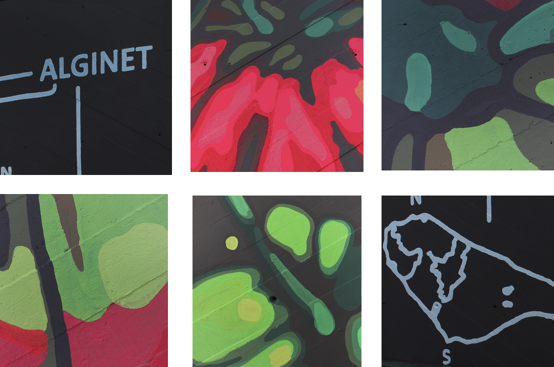 El disseny del mural es troba en fase exploratòria i es desenvoluparà a partir d’un procés de recerca històrica i participació ciutadana. La proposta pren com a possibles fils conductors cultius emblemàtics com la tomaca i el cacau, que han definit la tradició agrícola d’Alginet, així com referències a la fauna, la flora i l’aigua, entesa com a símbol de vida i de connexió amb el territori, especialment en relació amb les zones afectades per la DANA.