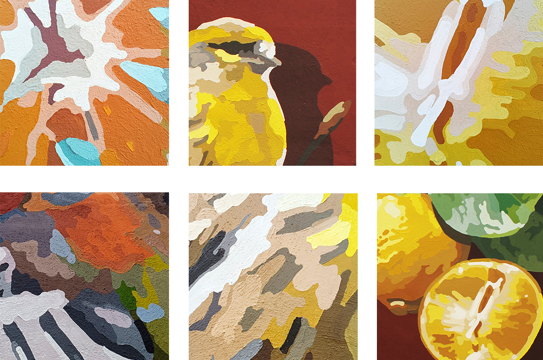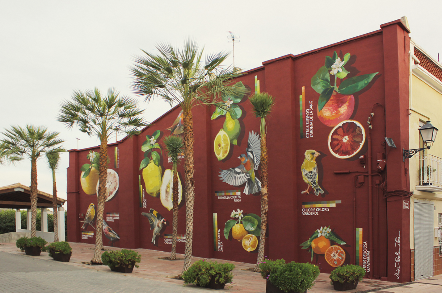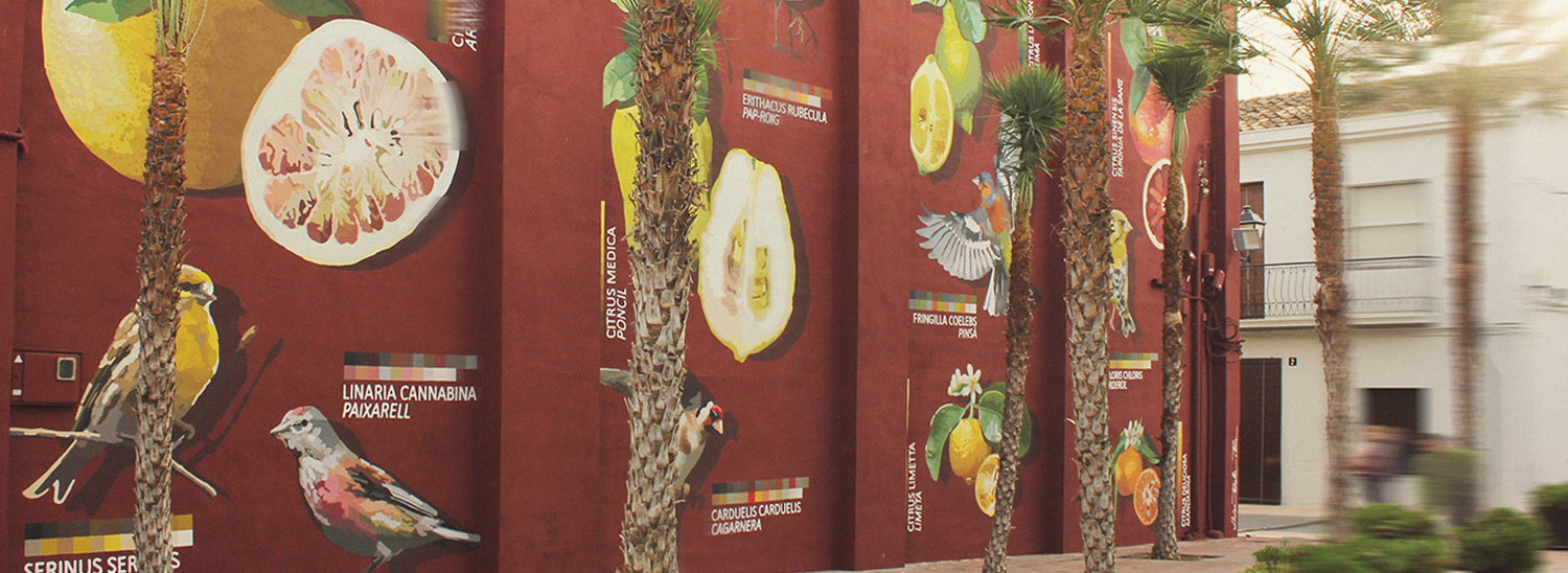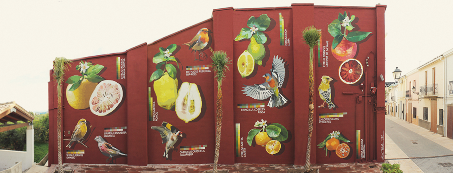 Seguint amb l'estètica d'un herbari o un animalari s'ha compost un mural amb l'assessorament de diferents agents socials com ara la fundació Citrus Todolí i membres del propi consistori, que ens va ajudar a decantar-se per les següents espècies: D'una banda pardalets cantors com el gafarró, el paixarell, la cagarnera, el pap-roig, el pinsà i el verderol; d'altra banda, els diversos grups varietals de cítrics més representatius geogràficament: l'aranja grossa, el poncil, la llima, la limeta, la taronja de la sang i la mandarina. Tots aquests exemplars es veuen acompanyats pels seus corresponents noms científics i les accepcions locals més comunes per a anomenar-los, així com, per la paleta cromàtica que els caracteritza, que per un costat ens ajuda a identificar-los tant en la composició mural com en la natura, i per altre, aporta un toc contemporani a la imatge final mostrant a l'espectador un dels aspectes tècnics més potenciats del treball artístic, l'ús del color.